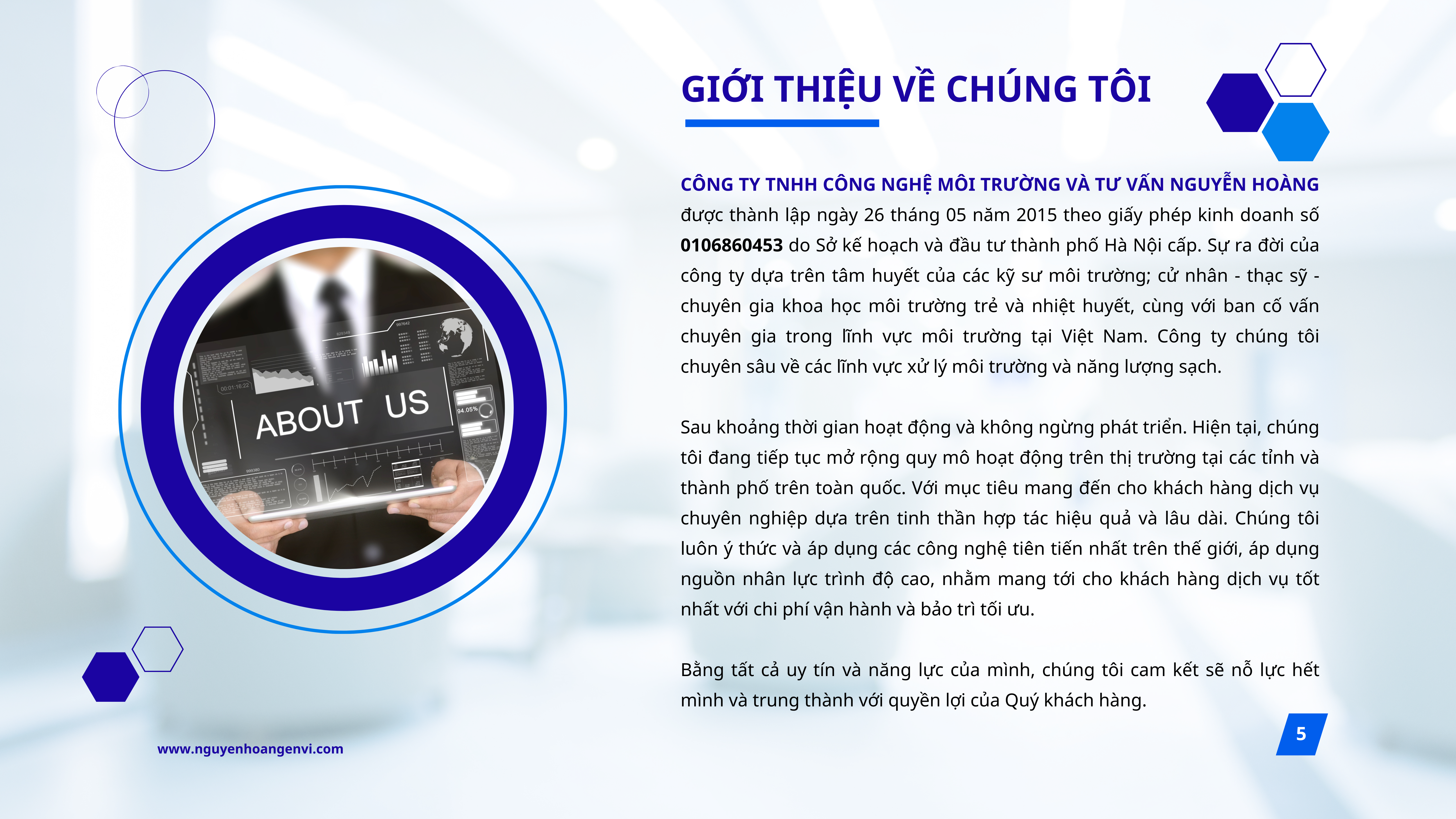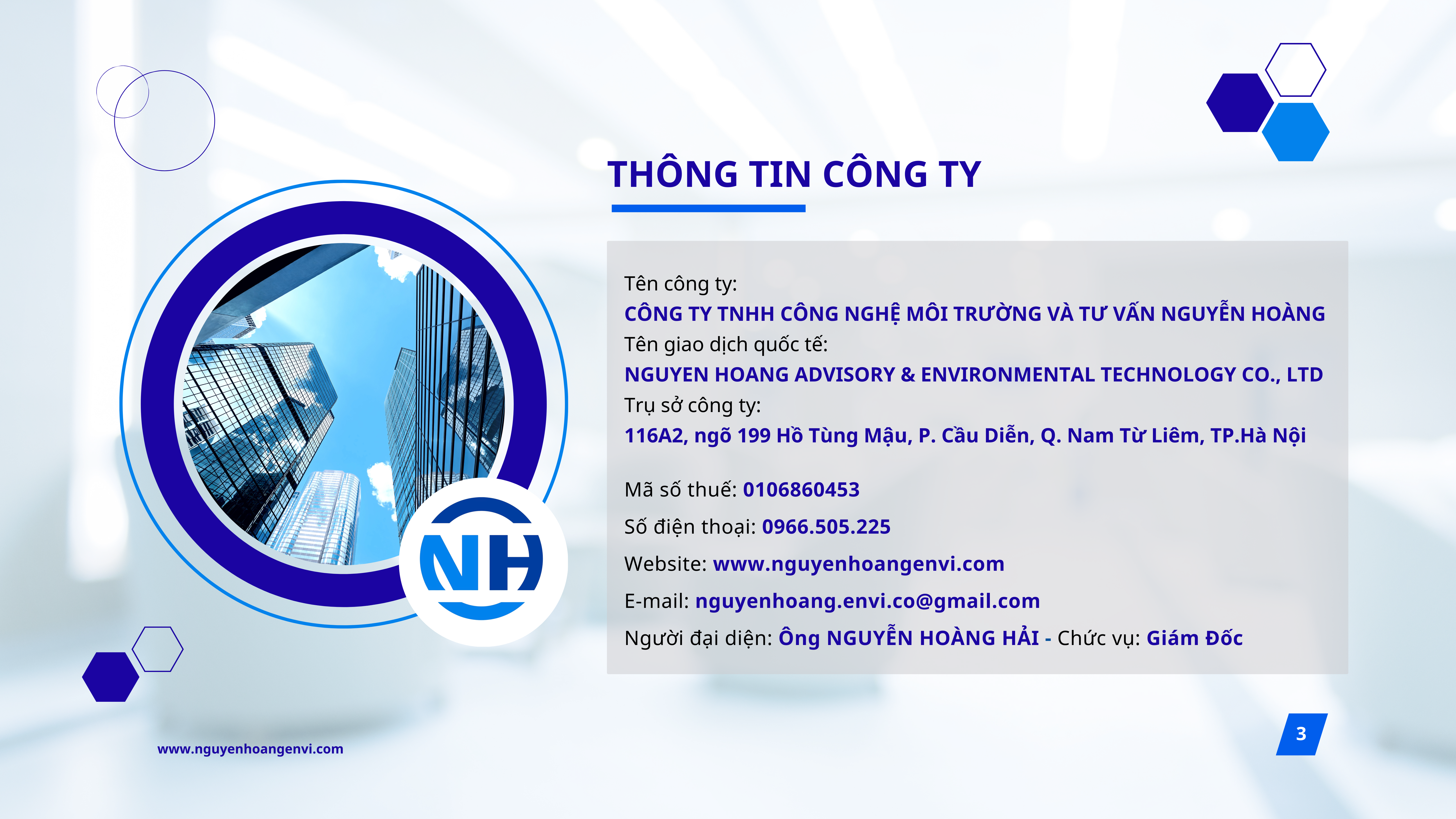 Với hơn 10 năm kinh nghiệm trong lĩnh vực môi trường, Công ty TNHH Công Nghệ Môi Trường và Tư Vấn Nguyễn Hoàng (Nguyễn Hoàng Envi) không ngừng nghiên cứu, ứng dụng và chuyển giao các công nghệ xử lý môi trường tiên tiến, góp phần mang lại những giải pháp hiệu quả và bền vững cho doanh nghiệp.
