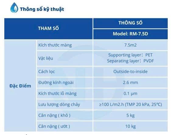 ĐẶC TÍNH MÀNG MBR MODEL RM - 7,5D: